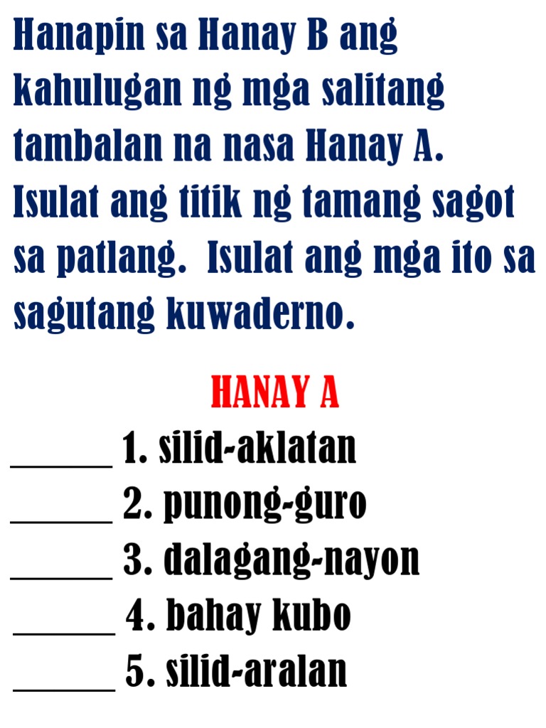 Hanapin Sa Hanay B Ang Kahulugan Ng Mga Salitang Tambalan Na Nasa Hanay A Pdf